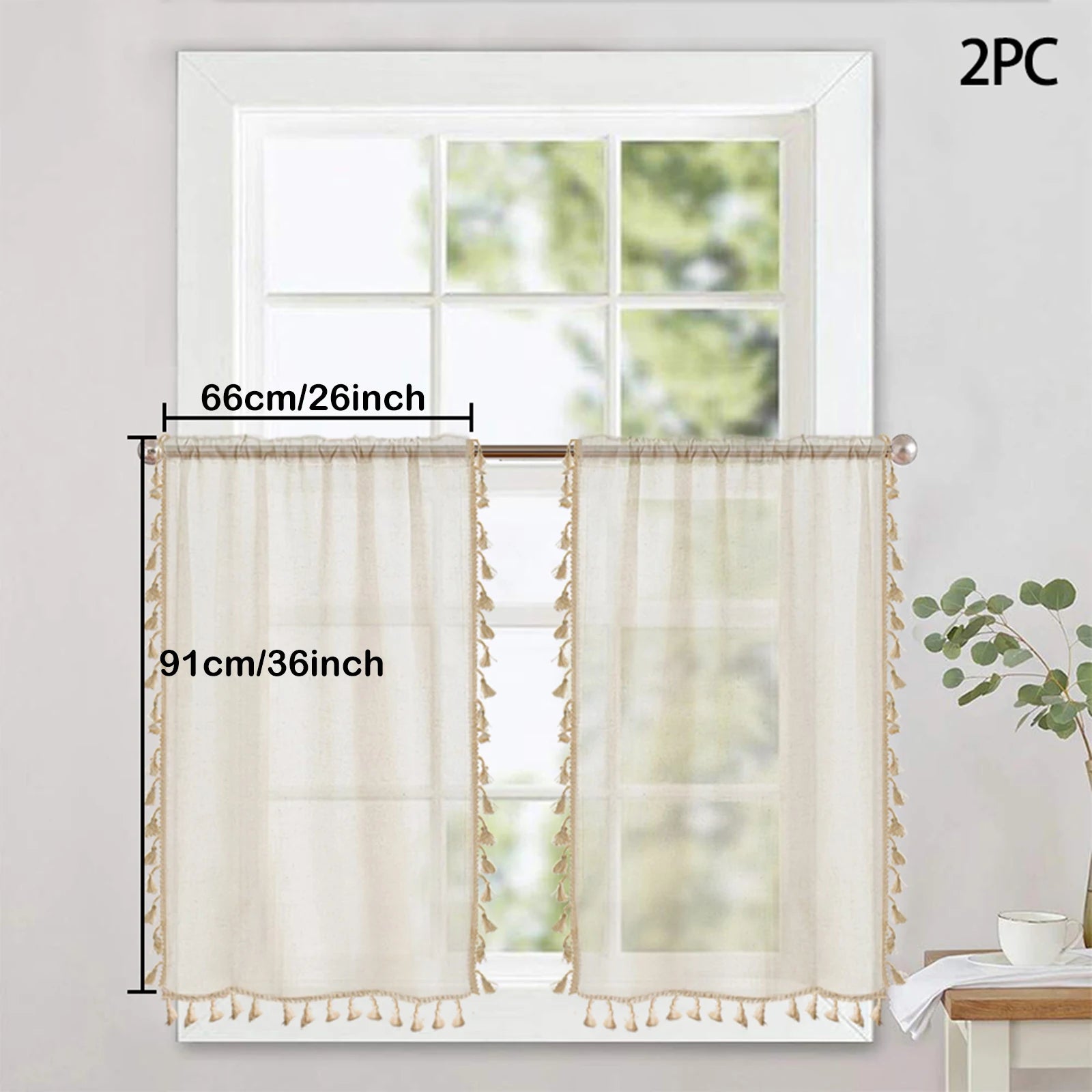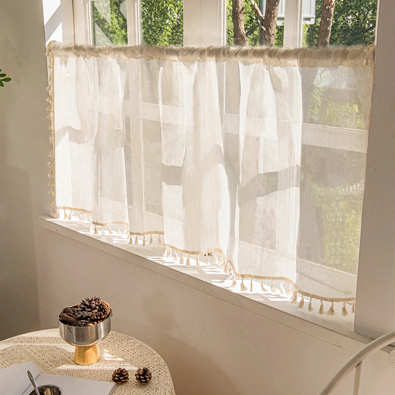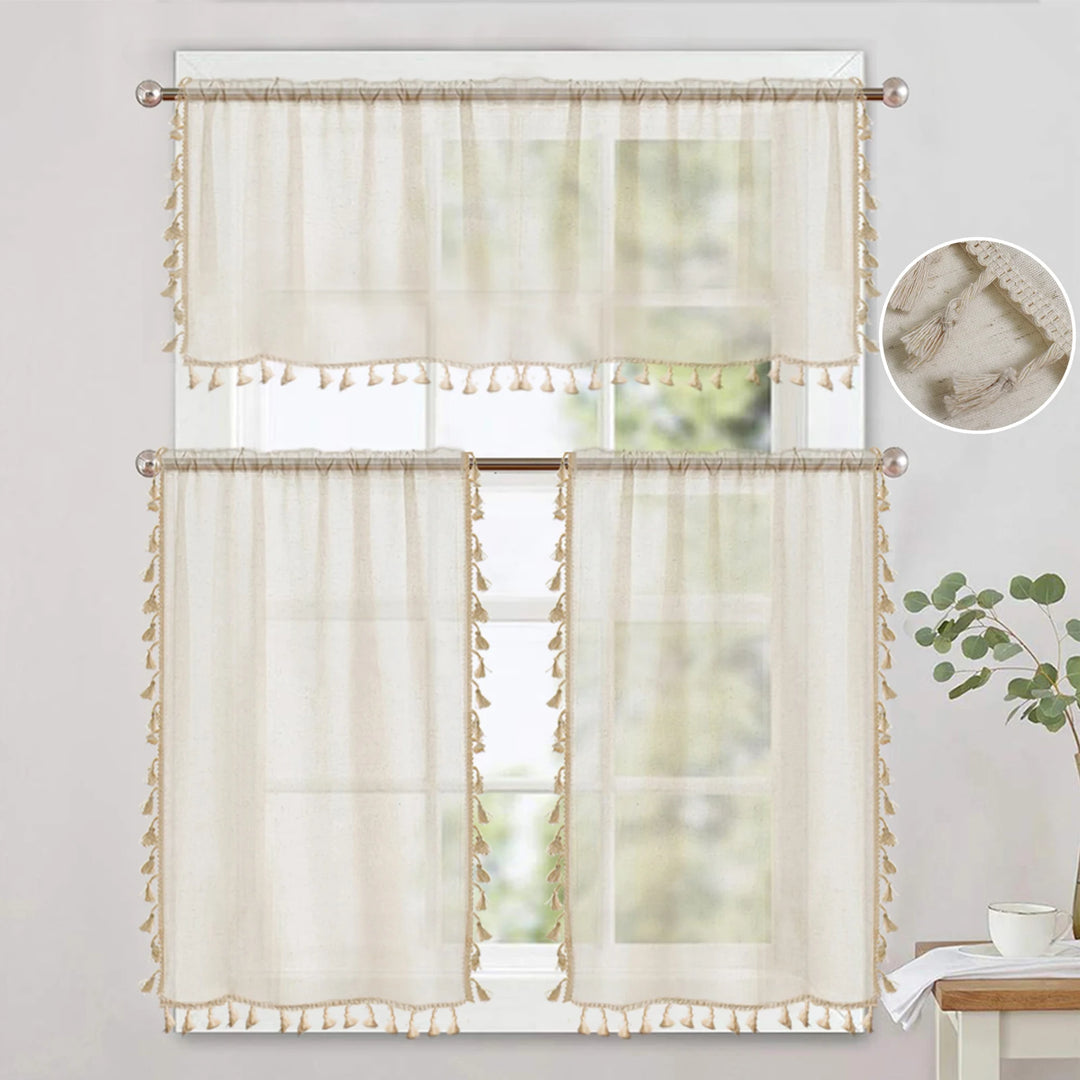 1/2 Panels Boho Kitchen Curtains Sheer Tier Curtains Tassels Linen Short Valance Rod Pocket for Small Window Bathroom Bohemian