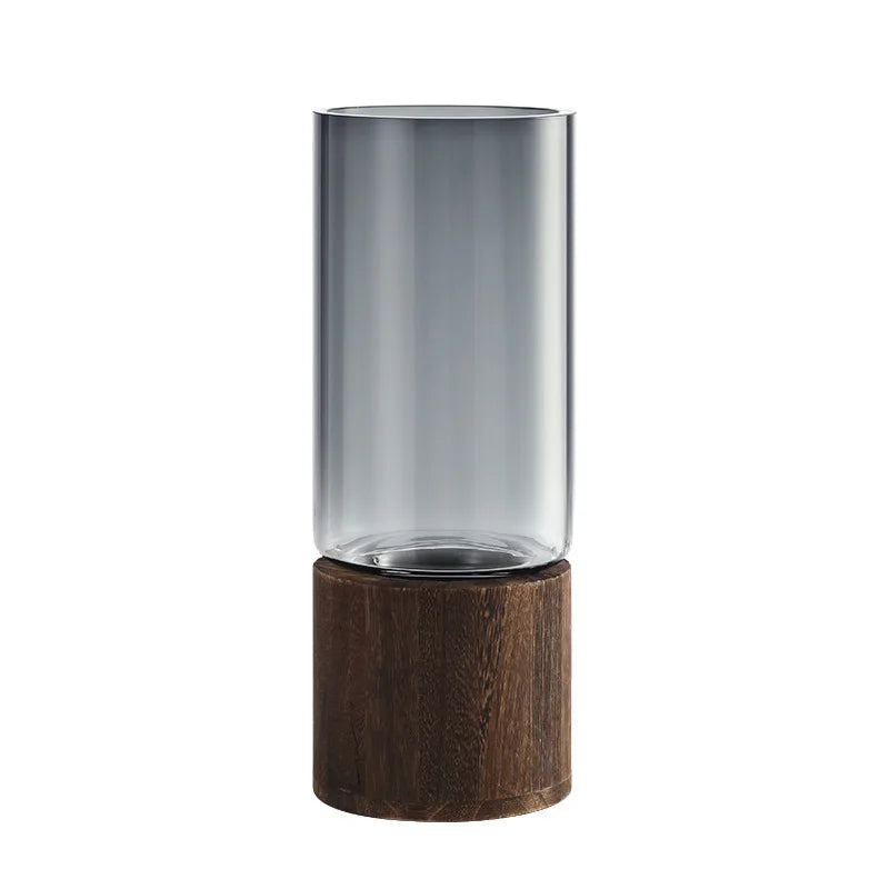 Creative glass vase with wooden base. Decorative piece for flower arrangement in the living room.