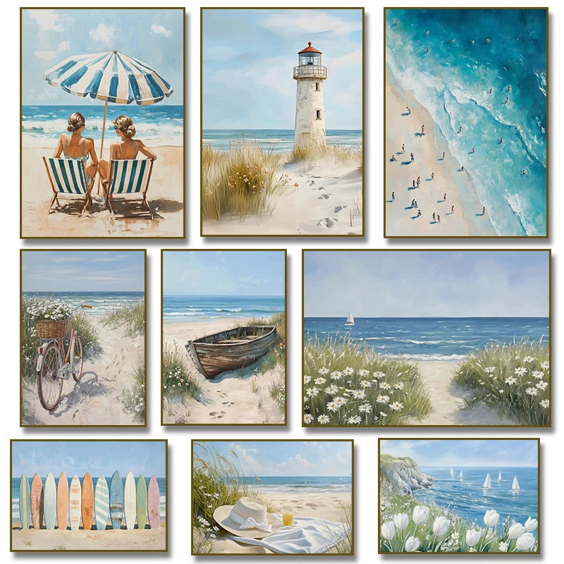 Coastal Ocean Beach Lighthouse Tulip Sailboat Surfboard Poster Canvas Painting Print Wall Art Picture for Living Room Home Decor