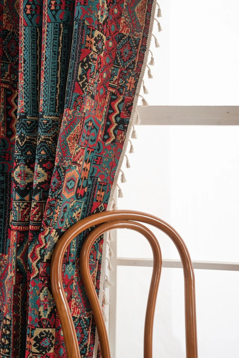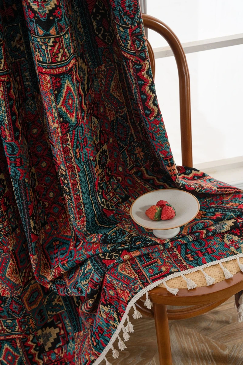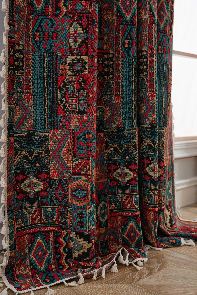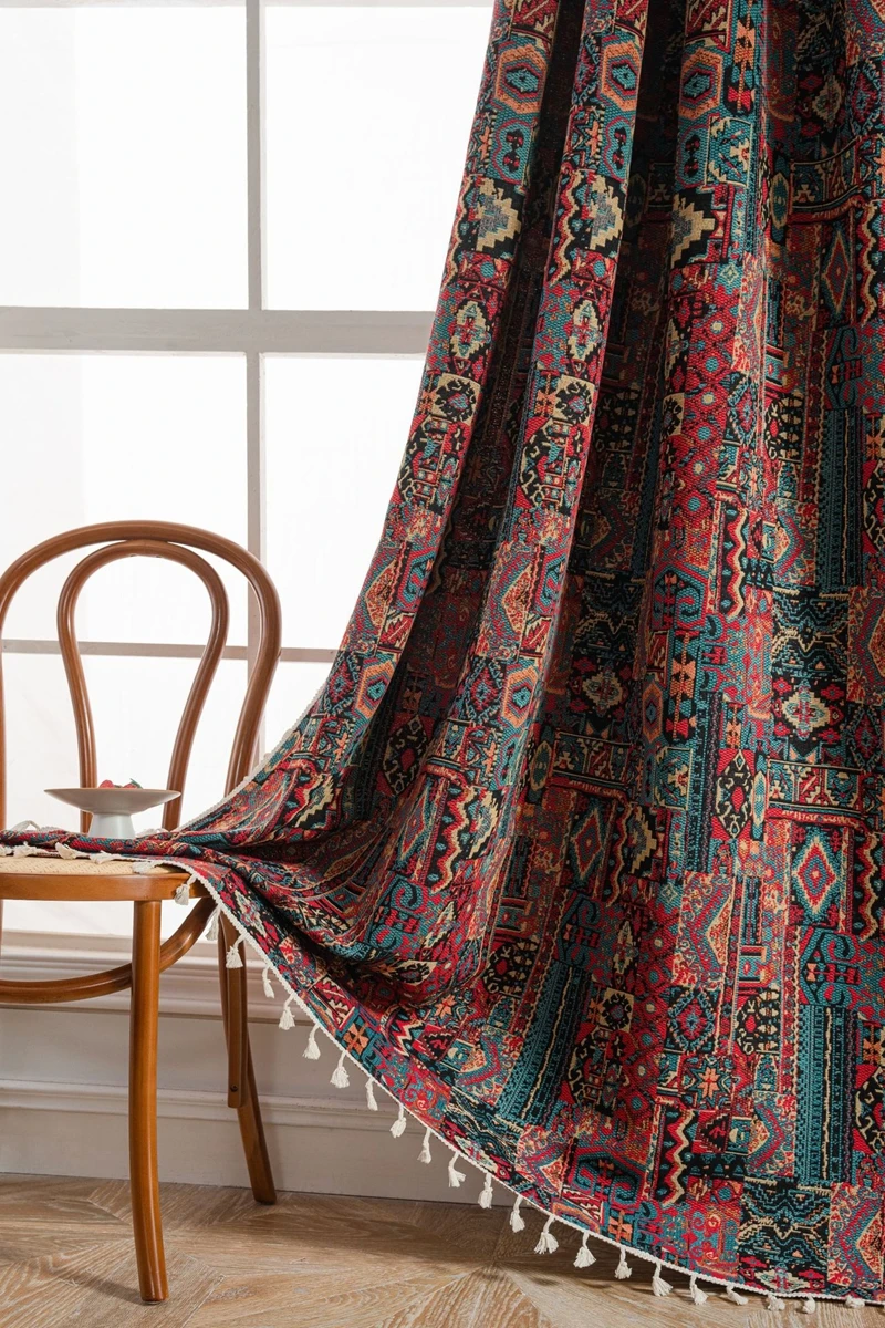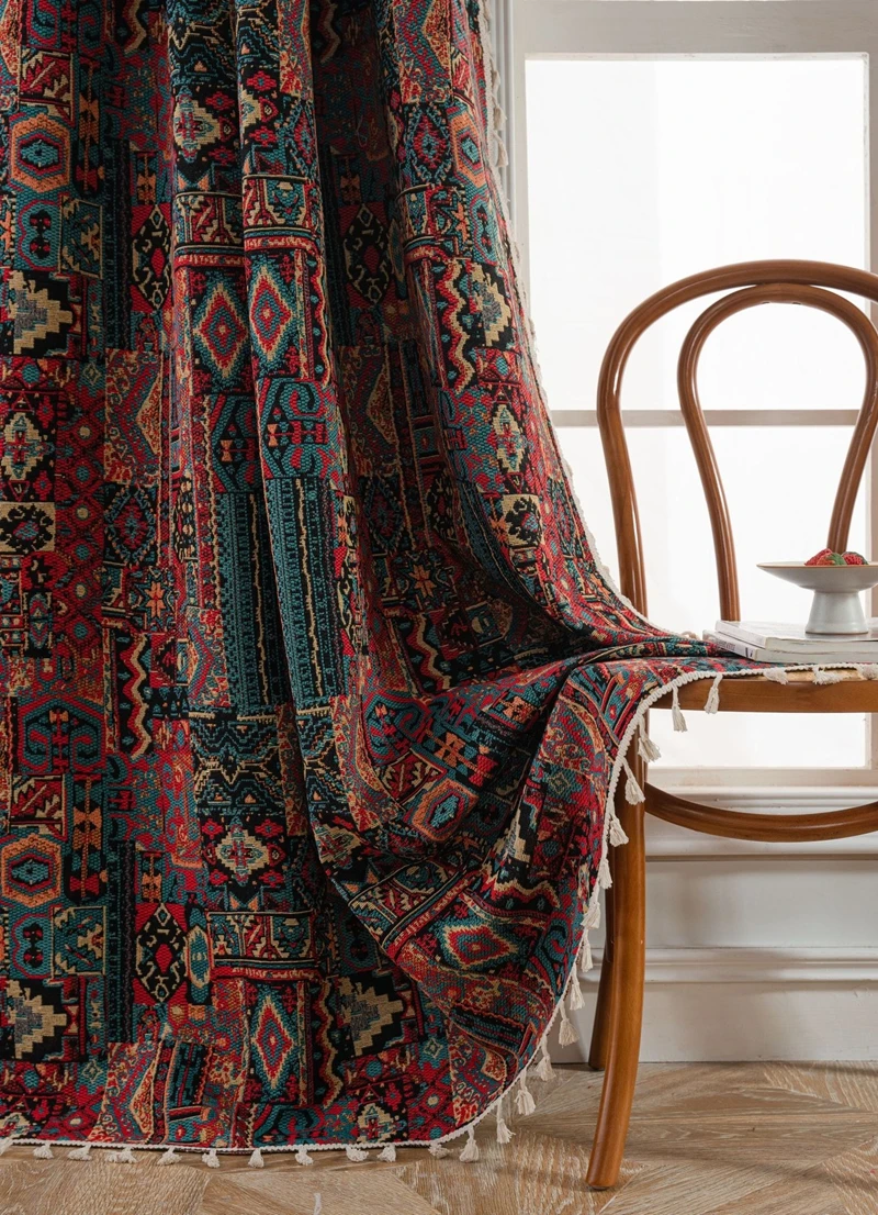 Bohemian Style Curtains Jacquard Geometric Tassel Curtain Finished Kitchen Valance Bedroom Living Room Semi-blackout Drapes