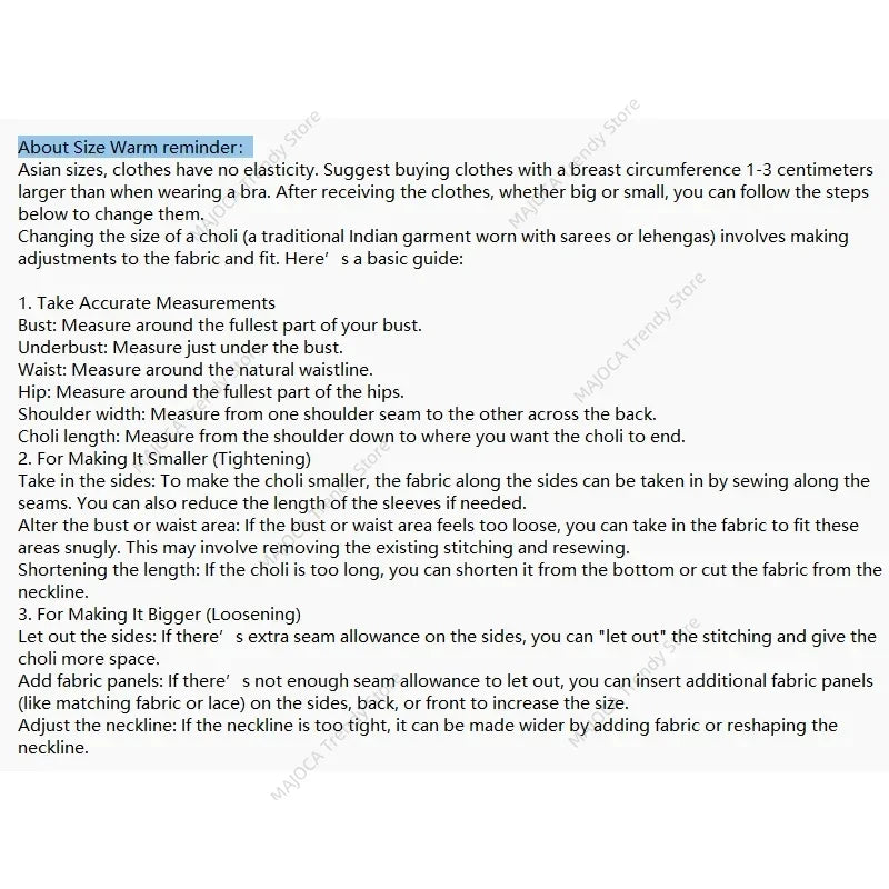 Changing the size of a choli (a traditional Indian garment worn with sarees or lehengas) involves making adjustments to the fabric and fit. Here's a basic guide: